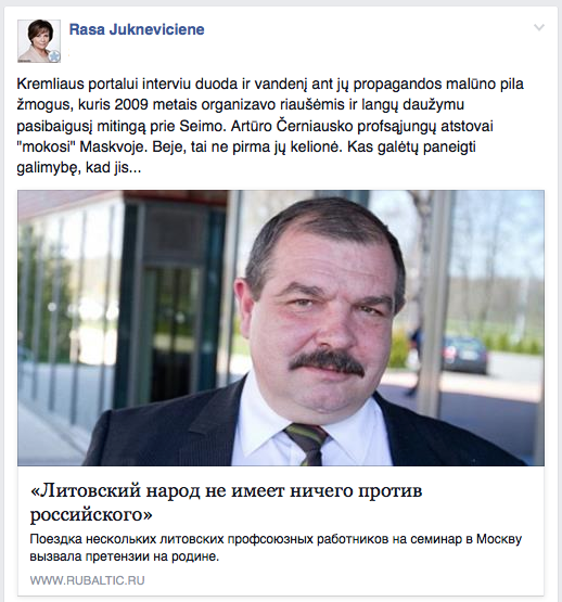 „Kremliaus portalui interviu duoda ir vandenį ant jų propagandos malūno pila žmogus, kuris 2009 metais organizavo riaušėmis ir langų daužymu pasibaigusį mitingą prie Seimo. Artūro Černiausko profsąjungų atstovai „mokosi“ Maskvoje. Beje, tai ne pirma jų kelionė. Kas galėtų paneigti galimybę, kad jis...“, - savo asmeninėje facebook paskyroje paskelbė pagrindinė Lietuvos gynėja.