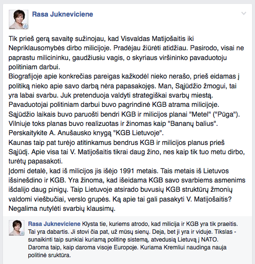 Pasak R. Juknevičienės, „klysta tie, kuriems atrodo, kad milicija ir KGB yra tik praeitis.“
