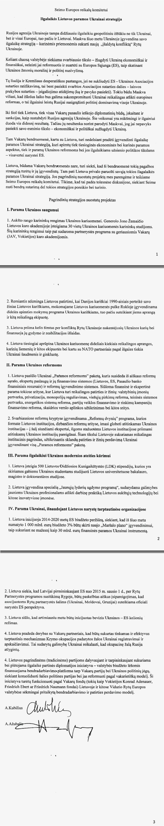 „Matydami, kad Rusijos agresija Ukrainoje tampa didžiausiu ilgalaikiu geopolitiniu iššūkiu ne tik Ukrainai, bet ir visai Europai, tuo pačiu ir Lietuvai, parengėme ir teikiame komitetui Lietuvos paramos Ukrainai strategiją“, - pranešė politikai.