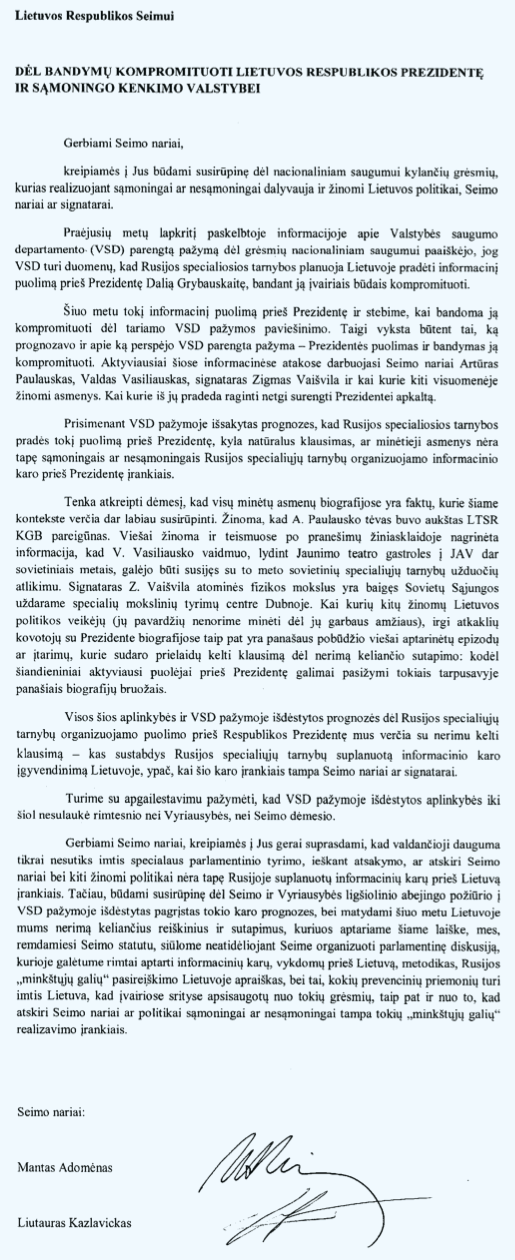 Kreipimesi primenama, kaip praėjusių metų lapkritį paviešintoje informacijoje apie Valstybės saugumo departamento (VSD) parengtą pažymą dėl grėsmių nacionaliniam saugumui paaiškėjo, jog VSD turi duomenų, kad Rusijos specialiosios tarnybos planuoja Lietuvoje pradėti informacinį puolimą prieš Prezidentę Dalią Grybauskaitę, bandant ją įvairiais būdais kompromituoti. Tačiau VSD pažymoje išdėstytos aplinkybės iki šiol nesulaukė rimtesnio nei Vyriausybės, nei Seimo dėmesio.