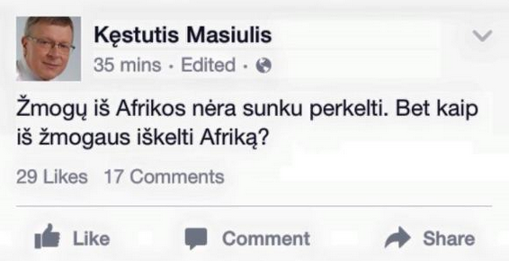 „Žmogų iš Afrikos nėra sunku perkelti. Bet kaip iš žmogaus iškelti Afriką?“, - prieš kurį laiką neslėpdamas savo rasistinių pažiūrų klausė K. Masiulis.