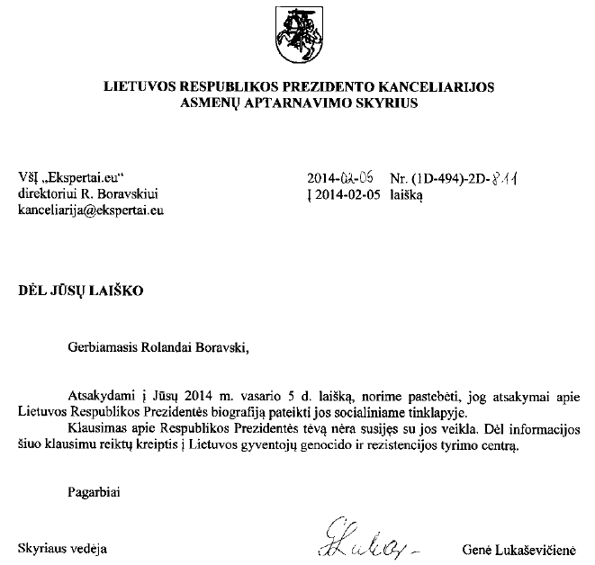3. Minėjote, kad iš Lietuvos gyventojų genocido ir rezistencijos tyrimo centro gavote patvirtinimą, jog Jūsų tėvas, būdamas 17–18 metų, dirbo gaisrininku ir nebuvo NKVD seržantas. Ar galėtumėte tą dokumentą (patvirtinimą) paviešinti?