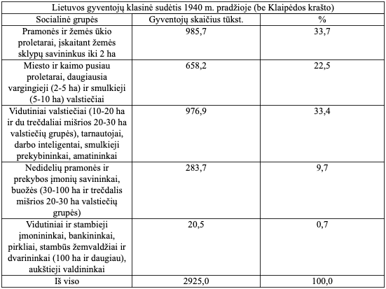 Tačiau ir situacija buvo atitinkama. Išskyrimas vien apdirbamosios gamybos darbuotojų šiuo atveju negali duoti pilnutinio klasinio pasidalijimo tuometėje visuomenėje vaizdo, nes Lietuvos tada būta agrarinio krašto. Kokia buvo jos klasinė sudėtis? Į tai atsako ši lentelė [5]: