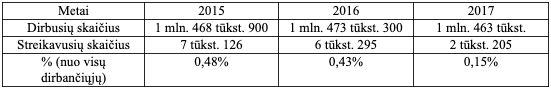 Kaip nekeista, žymesnio streikų judėjimo nėra. O kiek jo ir esama – tai visiškai ne darbininkiškas (ir tikrai ne proletariškas!) reiškinys. Kam reikia, tas žino, kad Lietuvoje streikuoja praktiškai vien arba medikai, arba pedagogai (būtent jie 2015, 2016 ir 2017 m. sudarė tuos kelis tūkstančius buvusių streikininkų). Kartais dar kažkokie kiti valstybės tarnautojai. Bet tik tiek.