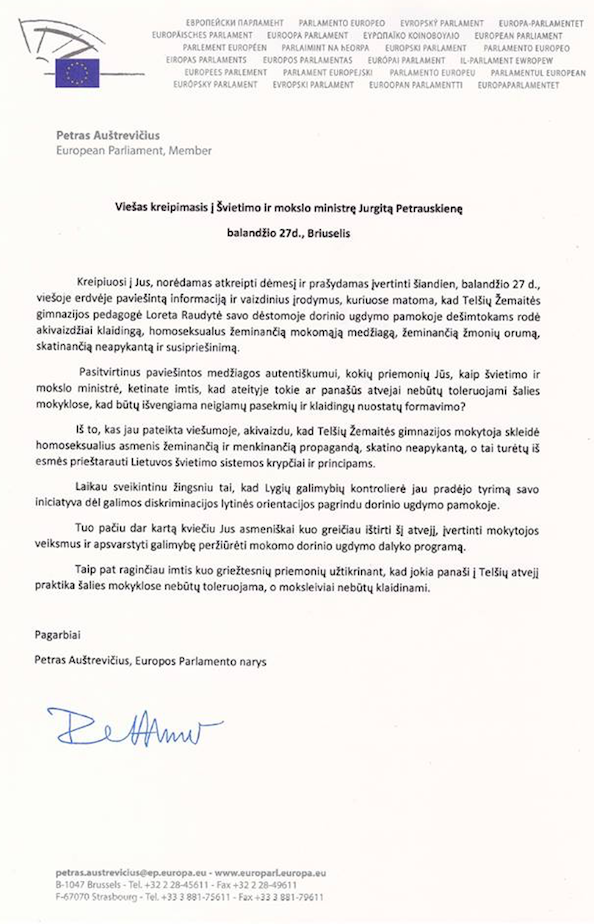 P. Auštrevičius parašė laišką Švietimo ir mokslo ministrei Jurgitai Petrauskienei.