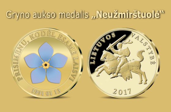 | Prisimename, kodėl esame laisvi. Medalyje įamžinta neužmirštuolė – iniciatyvos, skirtos atminti laisvės kovų didvyriams, simbolis. Medalis nukaldintas iš 999/1000 aukso, pristatomas proginėje dėžutėje, medalio tiražas – tik 1000 vnt. Medalis nukaldintas Lietuvos monetų kalykloje. Medalio kaina: 199 eurai |