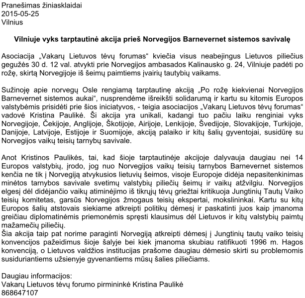 Renginio Osle idėjos iniciatorė, norvegė May Lund Nicolaisen kviečia visus lietuvius prisijungti prie akcijos gegužės 30 d., 12 val. prie Norvegijos ambasados ir atnešti po rožę išplėštiems iš šeimų vaikams.