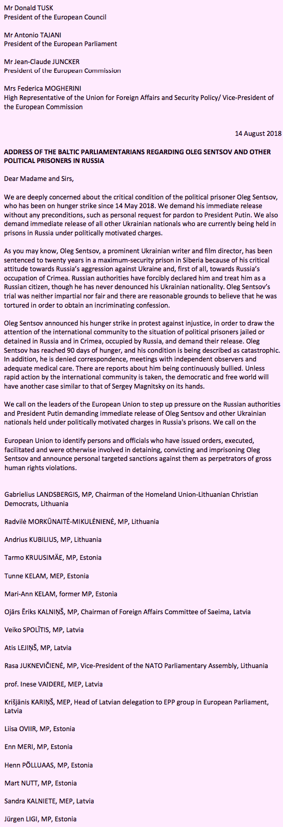 „Baltijos šalių parlamentarai reikalauja nedelsiant paleisti Olegą Sencovą, kuris protestuodamas prieš Rusijos veiksmus badauja nuo gegužės 14 d., bei kartu išlaisvinti visus Ukrainos piliečius, kurie Rusijos kalėjimuose laikomi dėl politinių motyvų“, - sakoma pranešime.