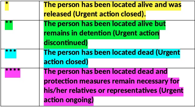 Jungtinių Tautų skelbiamame dingusių žmonių sąraše kiekvienas žmogus yra žymimas konkrečia spalva.