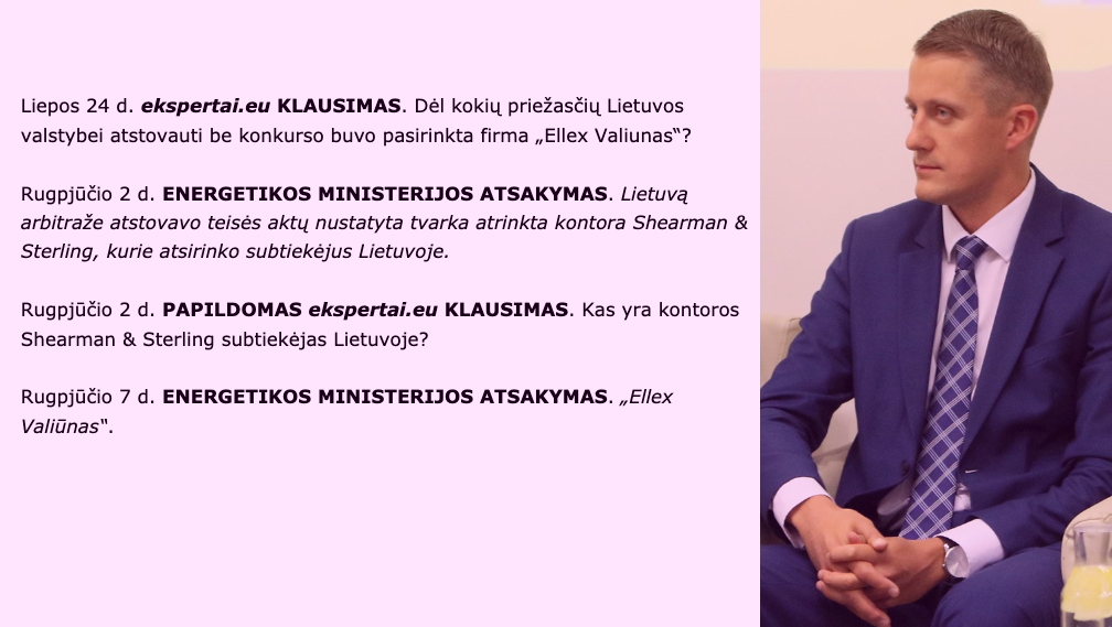 Rugpjūčio 7 d. ENERGETIKOS MINISTERIJOS ATSAKYMAS. Rekomenduojame kreiptis į „Shearman & Sterling“.