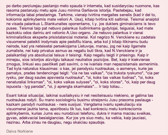 „Užuot pasidžiaugę, kad atsirado liudijimas, jog vaikas konkrečiu metu buvo gyvas ir sveikas, dalis žmonių suskubo įtarti, kad žurnalistė, o gal ir jos aplinka, priklauso „pedofilų klanui“. Suveikė lietuviškas fenomenas: visuomenė nepasiruošusi priimti gerų žinių, ir jei būtų pranešta, kad vaikas mirė, dalis jos narių pasijustų tikriausiai kur kas geriau, o nuotraukas portalui leidusi panaudoti žurnalistė ir sociologė ko gero pelnytų didvyrės vardą.”