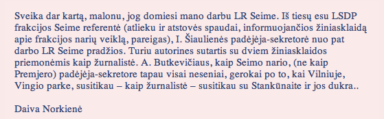 Tiek pirmajame delfi.lt rašinyje, tiek interviu ekspertai.eu metu iš pradžių buvo visiškai nutylėta aktyvi politinė D. Norkienės veikla. O juk ji yra ir socialdemokratų partijos narė, ir LSDP frakcijos Seime referentė, atliekanti atstovės spaudai funkcijas, ir Seimo narių Irenos Šiaulienės bei Algirdo Butkevičiaus padėjėja-sekretorė.