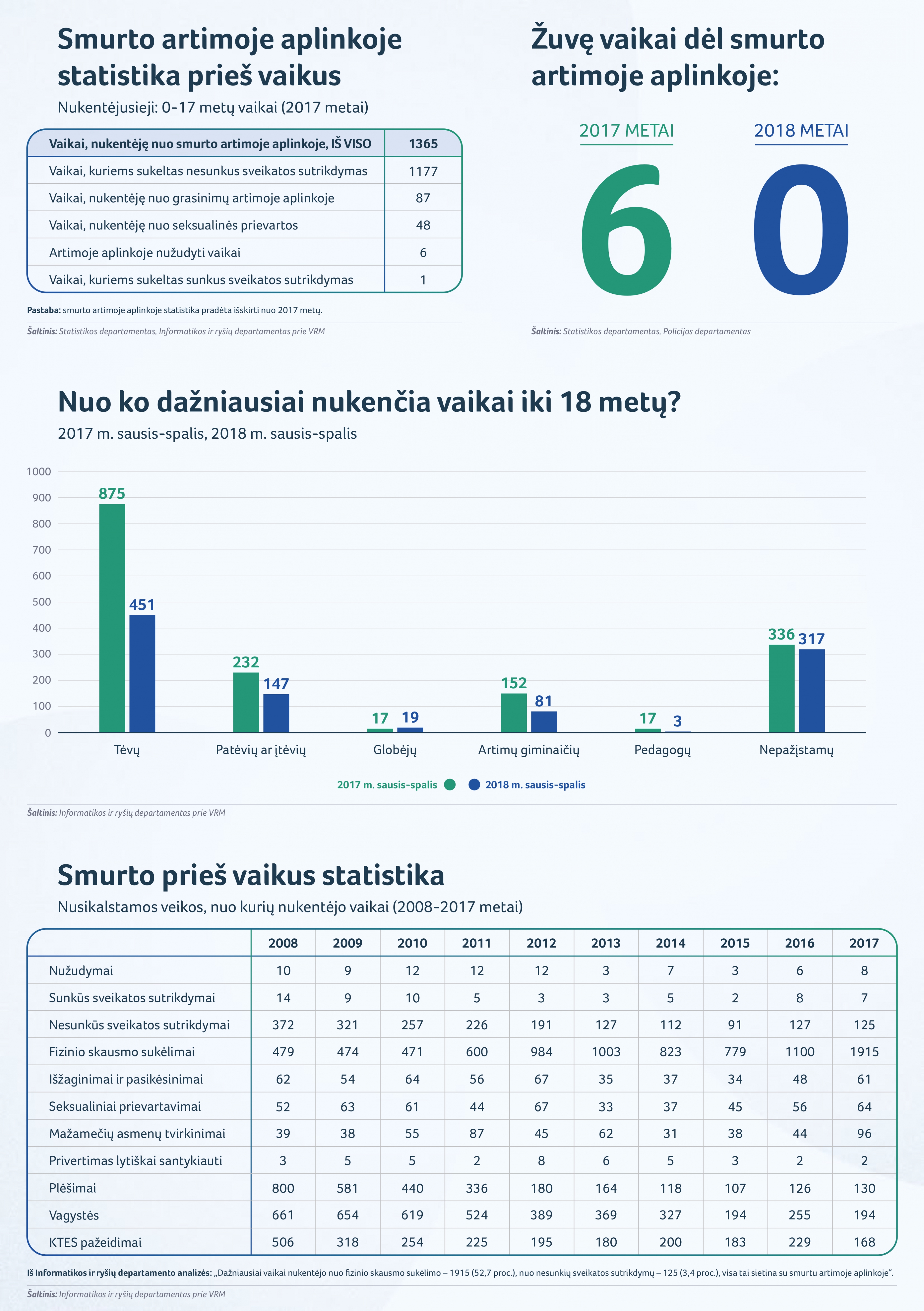 Kaip rodo Informatikos ir ryšių departamento duomenys, dažniausiai vaikai nukenčia nuo tėvų. Prisegama diagrama, kuri parodo, kad 2017 m. sausio-spalio mėn. nuo tėvų nukentėjo 875 vaikai, šiais metais per tą patį laikotarpį – 451 vaikas. Kalbant apie kitus pavojaus šaltinius vaikams, tai antroje vietoje yra nepažįstami asmenys, patėviai ar įtėviai, toliau artimi giminaičiai, o gale atsiduria globėjai ir pedagogai (žr. diagramą).