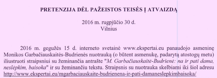 Moteris pasipiktino, kad tinklalapis ekspertai.eu panaudojo jos nuotrauką iliustruoti straipsniui su žeminančia atrašte „M. Garbačiauskaitė-Budrienė: na ir pati dama, neslėpkim, baisoka“ ir su žeminančiu tekstu.