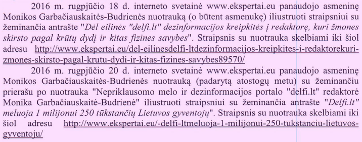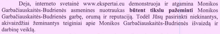 „Interneto svetainė ekspertai.eu demonstruoja ir atgamina Monikos Garbačiauskaitės-Budrienė asmenines nuotraukas būtent tikslu pažeminti Monikos Garbačiauskaitės-Budrienės garbę, orumą ir reputaciją. Todėl Jūsų pasirinkti niekinantys akivaizdžiai žeminantys teiginiai apie Monikos Garbačiauskaitės-Budrienės išvaizdą ir darbinę veiklą“, - sakoma M. Garbačiauskaitės-Budrienės rašte.