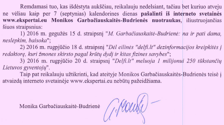 Nepriklausomos portalo delfi.lt redaktorė pareikalavo per 7 kalendorines dienas pašalinti iš interneto svetainės ekspertai.eu Monikos Garbačiauskaitės-Budrienės nuotraukas, iliustruojančius šiuo straipsnius: