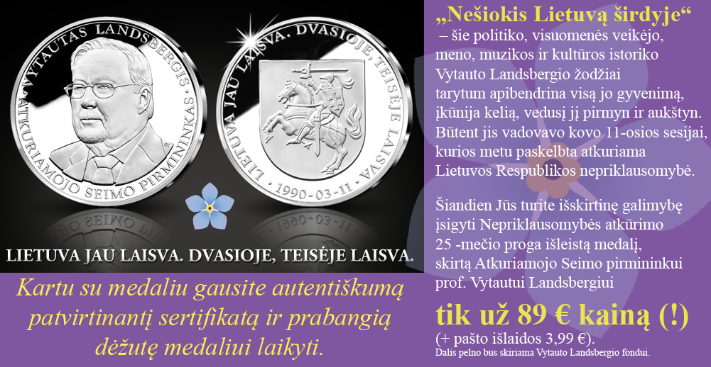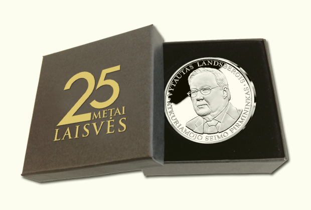 Šiandien Jūs turite išskirtinę galimybę įsigyti Nepriklausomybės atkūrimo 25-mečio proga išleistą medalį, skirtą Atkuriamojo Seimo pirmininkui prof. Vytautui Landsbergiui tik už 89 € kainą (+ pašto išlaidos 3,99 €). Dalis pelno bus skiriama Vytauto Landsbergio fondui.