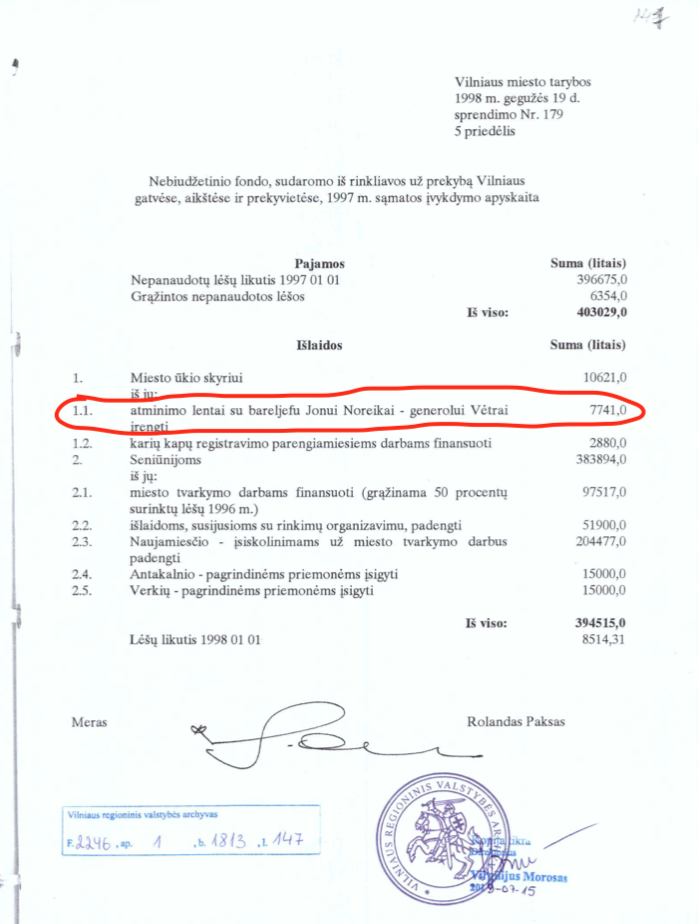 Ekspertai.eu primena, kad šios lentos pagaminimą finansavo Vilniaus savivaldybė – tuometinis sostinės meras Rolandas Paksas (1997–1999 m. jis buvo Tėvynės sąjungos nariu) šiai lentai 1998 metais skyrė virš septynių tūkstančių litų.