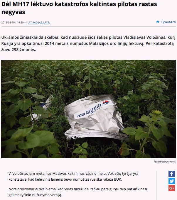 „V. Vološinas jam metamus Maskvos kaltinimus vadino melu. Vokiečių tyrėjai yra konstatavę, kad keleivinis laineris buvo numuštas rusiška raketa BUK“, - skelbiama lrt.lt publikacijoje „Dėl MH17 lėktuvo katastrofos kaltintas pilotas rastas negyvas“.