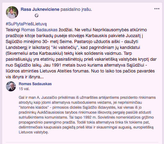 „Teisingi Romo Sadausko žodžiai. Ne veltui Nepriklausomybės atkūrimo pradžioje kitoje barikadų pusėje stovėjęs Karbauskis pakvietė Juozaitį į Sąjūdžio minėjimo 30- metį Seime. Pastarojo užduotis aiški – daužyti Landsbergį ir laikotarpį „iki valstiečių“, kad pagrindiniam jų kandidatui (Skverneliui arba Karbauskiui) tektų kiek solidesnis vaidmuo. Tarp pasirašiusiųjų yra etatinių pasirašinėtojų prieš vakarietišką valstybės kryptį dar nuo Sąjūdžio laikų. Jau 1991 metais buvo kuriama alternatyva Sąjūdžiui - liūdnos atminties Lietuvos Ateities forumas. Nuo to laiko tos pačios pavardės vis išnyra ir išnyra...“, - visuomeniniuose tinkluose paskelbė R. Juknevičienė.