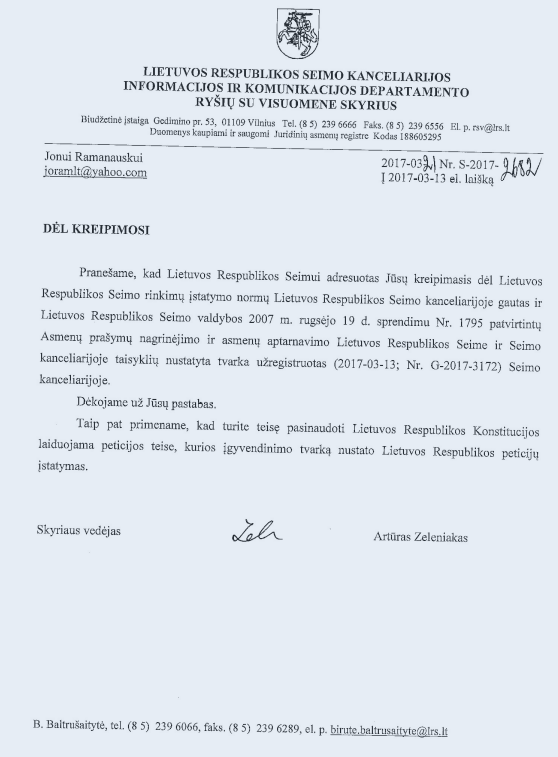 Gavau tokį atsakymą, žiūrėti paveikslėlį aukšiau. Toks atsakymas įrodo, kad elektroninis laiškas ir visi laiškai NEPRAPUOLĖ interneto platybėse, o ir prapulti negalėjo, nes elektroninio pašto sistema yra tokia, jei laiškas nepasiekia adresato, tai sugrįžta. Naudoju tik oficialiai paskelbtus emailus. Niekas nesugrįžo, reiškia ir visi Seimo nariai, jų padėjėjai ir Seimas, Vyriausybė ir Prezidentūra juos gavo. Užregistravo tik Seimas, nesvarbu kuris Seimo padalinys. Svarbu, kad užregistravo. Tačiau pagal užregistravimo dokumentą niekaip negalima suprasti ką užregistravo. Juk aiškiai prie lydraščio prijungiamas 2017-3-11 dokumentas pdf formate su komentarais „Okupuota nepriklausomybė“. Pabandykite tame Seimo kanceliarijos atsakyme surasti dokumento, kurį užregistravo pavadinimą. Jo nėra, nežinia ką užregistravo, gal kokį nors padirbtą? Negali žinoti. Man tai yra suprantama, nes kitokių dokumentų 2017-3-13 į Seimą, Vyriausybę ir Prezidentūrą nesiunčiau. Tačiau būti tikru, kad tas dokumentas „Okupuota nepriklausomybė“ yra tikrai užregistruotas, tai iš Seimo kanceliarijos atsakymo to suprasti tikrai negalima.