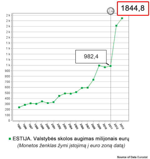 Estijos skola padvigubėjo po euro įvedimo 2011. Ir visos daugiametės Estijos vyriausybės pastangos laikantis griežtos ekonominės politikos, kova su gyventojais reikalaujančiais didinti atlyginimus ir kitos nepopuliarių priemonių duoti rezultatai – metų bėgyje išlėkė per kaminą. Ir tai įvyksta ne krizės įkarštyje, kas galėtų būti suvokiama, o po krizės.