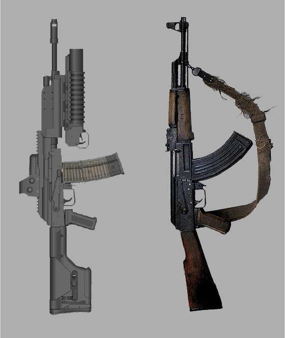 | Valstybės sienos apsaugai mūsų gynėjai teturi senus rusiškus kalašnikovus (dešinėje). Naujesnių (kairėje) rusiškų kalašnikovų, kaip ir daugybės kitų būtinų daiktų, Lietuvos valstybė neišgali nupirkti. |