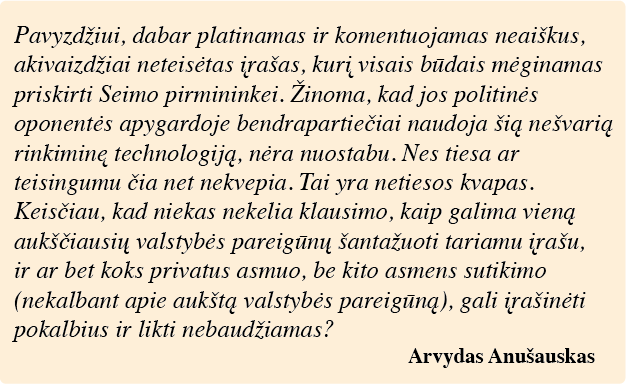 Šis vienas svarbiausių šalies politikų savo rašinėliu bando įteigti, kad Seimo pirmininkės Irenos Degutienės pokalbio paskelbimas viešumoje tolygus šantažui.