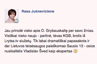 – Artėja dar viena sausio 13-oji. Pirmoji - po Lietuvos finansinės nepriklausomybės praradimo, pirmoji – po Sausio 13-osios bylos nutraukinėjimo. Jaučiasi įtampa, Rusija vis dažniau prisimena mūsų karingąją prezidentę. Seimo narė Rasa Rastauskienė – Juknevičienė, atsišaukdama į Rusijos pirmojo TV kanalo laidos „Vesti“ gruodžio 4 d. reportažą apie Lietuvos prezidentę D. Grybauskaitę, š.m. sausio d. savo facebook paskyroje atskleidė visiems faktų, kurių bent ekspertai.eu redakcija neturėjo. Signatarė patvirtino, kad p. D. Grybauskaitės tėvas dirbo KGB. Iki šiol, dokumentai liudijo, kad prezidentės tėvelis buvo tik NKVD'istas, o vėliau tremtinys. Kodėl Seimo narė, žinodama tokį faktą, tik dabar apie tai pasakė?