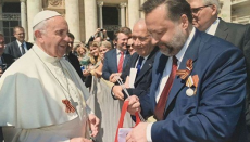 Gegužės 5 d. popiežius Pranciškus iš Rusijos komunisto rankų priėmė ir užsisegė „Georgijaus juostelę“, kuri Rusijoje simbolizuoja „pergalę prieš fašizmą“.