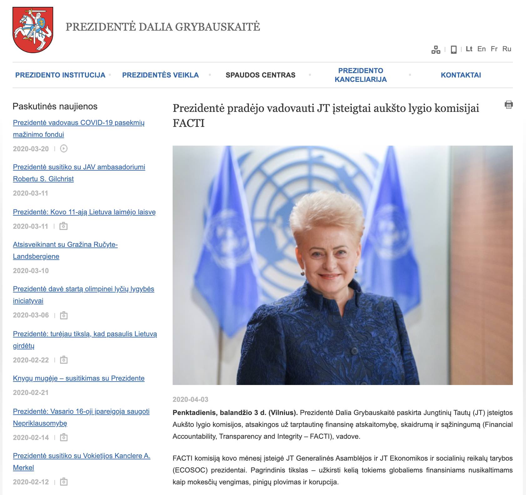 „Komisiją (angl. Financial Accountability, Transparency and Integrity – FACTI) kovo mėnesį įsteigė JT Generalinės Asamblėjos ir JT Ekonomikos ir socialinių reikalų tarybos prezidentai. Pagrindinis jos tikslas – užkirsti kelią tokiems globaliems finansiniams nusikaltimams kaip mokesčių vengimas, pinigų plovimas ir korupcija“, - skelbiama prezidentiniame prezidentės portale.