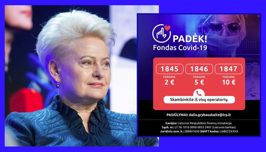 „Atsiskaitome Jums! Naujausias fondo pirkinys – dar 2000 vnt. FFP2 respiratorių prie ankstesnių 3000 vnt., nupirktų šią savaitę. Dar 14 tūkst. eurų skirta mokslininkams, pasiruošusiems sukurti įrankius viruso sukeliamos infekcinės ligos diagnostikai ir prevencijai. Šią savaitę taip pat laukiame atvykstant ir plaučių ventiliatorių. Dirbame toliau, o nuo šiandien susitelkti kovai su koronavirusu tapo dar lengviau! Ėmė veikti trumpieji telefonų numeriai, kuriais prisidėti prie fondo veiklos itin paprasta: 1845 – 2 eurai, 1846 – 5 eurai, 1847 – 10 eurų. Dėl bendro tikslo mobiliojo ryšio bendrovės atsisakė savo mokesčio už paslaugas!“, - visuomeniniuose tinkluose informavo be atokvėpio dirbanti prezidentė.