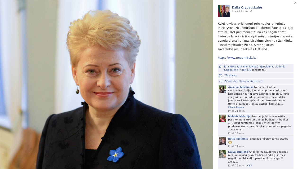 Prezidentė Dalia Grybauskaitė savo asmeninėje facebook paskyroje kviečia visus prisijungti prie naujos pilietinės iniciatyvos „Neužmirštuolė“, skirtos Sausio 13-ajai atminti.