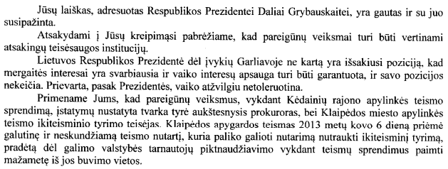 Prezidentės D. Grybauskaitės klausėme, ar ji mato šiame vaizdo įraše tą patį, kaip ir mes, t. y. pareigūną, kuris daužo gulinčiam ir nesipriešinančiam vyrui į tarpkojį? Tuo atveju, jei šalies vadovė mato ką nors kita, prašėme paaiškinti – ką konkrečiai? Klausėme, ar asmeniškai D. Grybauskaitė pateisina tokius veiksmus. Taip pat prašėme pasakyti, ar pareigūnai gali taip elgtis su Lietuvos piliečiais, o prokuratūra ir teismai - dangstyti tokius nusikaltimus.