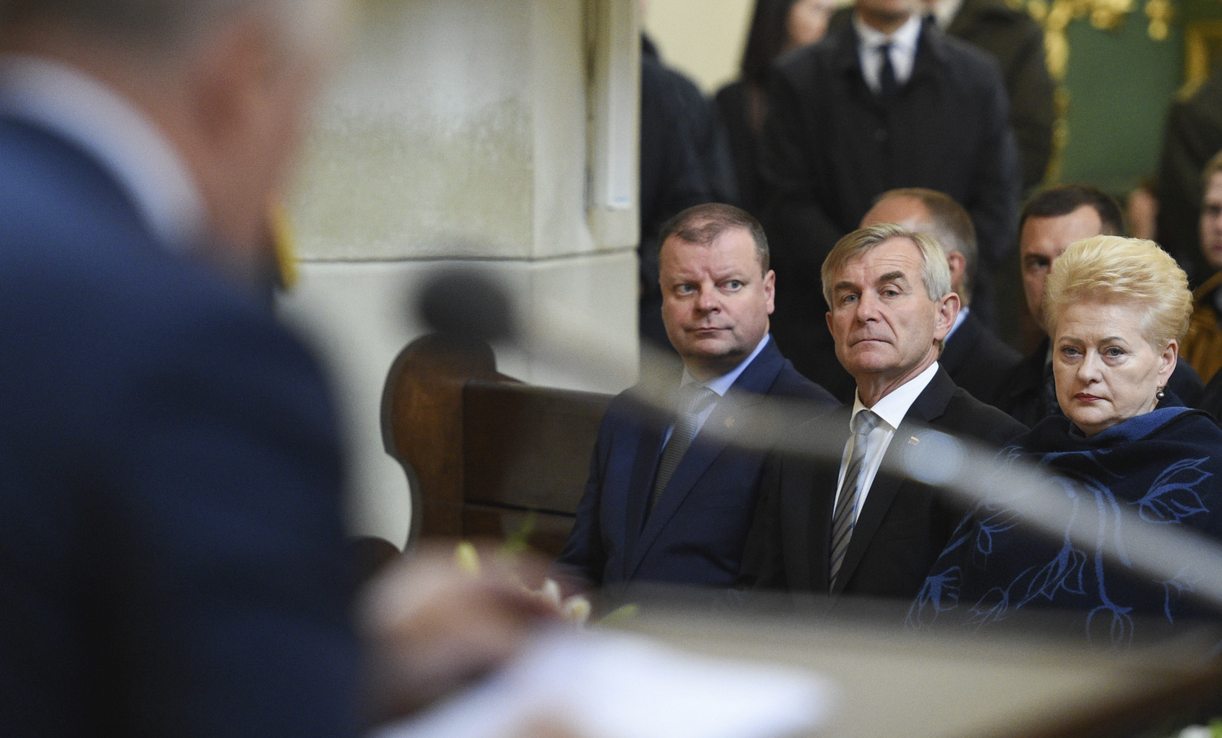Prezidentė Dalia Grybauskaitė Vilniaus universiteto Šv. Jonų bažnyčioje padėjo gėlių vainiką ir pagerbė partizanų vado Adolfo Ramanausko-Vanago, nukankinto 1957 m., atminimą.
