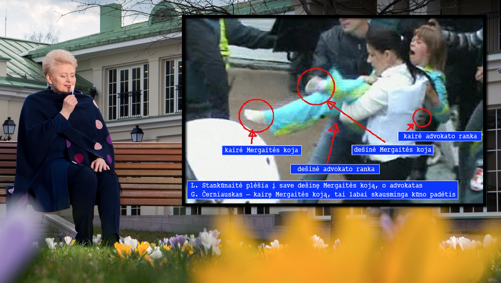 | Prezidentė D. Grybauskaitė ant suoliuko medituoja savo darbovietės kieme. Juodame rėmelyje – Deimantės Kedytės (Stankūnaitės) išlaisvinimo operacijos be prievartos akimirka. |