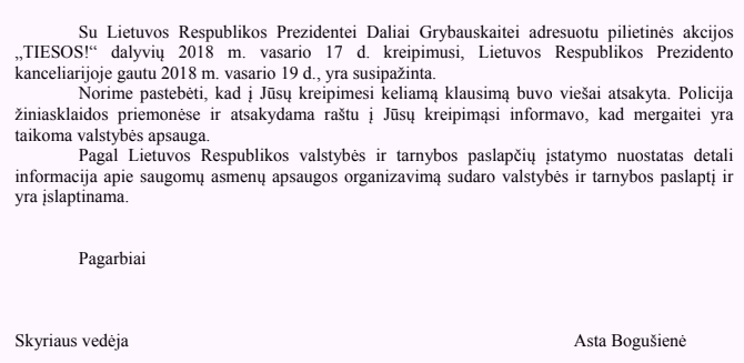 Prieš keletą dienų piliečiai pagaliau sulaukė rašto iš Prezidentūros, kuriame teigiama, kad prezidentė Dalia Grybauskaitė taip pat susipažino su pilietinės akcijos „TIESOS!“ dalyvių kreipimusi.