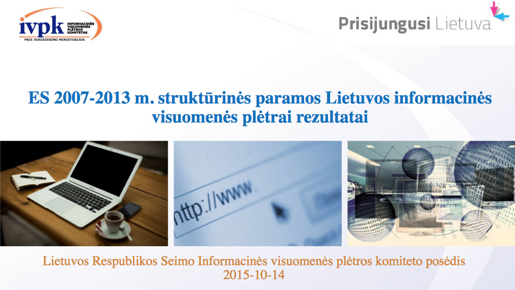 O ekspertai.eu skaitytojų dėmesiui siūlome išklausyti ataskaitą apie ES 2007–2013 m. struktūrinės paramos Lietuvos informacinės visuomenės plėtrai rezultatus, kuri buvo pristatyta spalio 14 d. Seimo Informacinės visuomenės plėtros komiteto posėdžio metu. Apie sėkmingai įsisavintą milijardą litų papasakojo Ryšių reguliavimo tarnybos tarybos narys, Informacinės visuomenės plėtros komiteto prie Susisiekimo ministerijos direktorius, UAB „Prinus Projects“ vadovas Ramūnas Čepaitis.