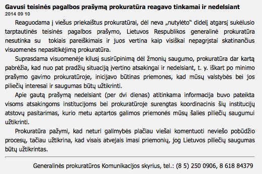 Reaguodama į viešus priekaištus prokuratūrai, dėl neva „nutylėto“ didelį atgarsį sukėlusio tarptautinės teisinės pagalbos prašymo, Lietuvos Respublikos generalinė prokuratūra nesutinka su tokiais pareiškimais ir juos vertina kaip visiškai nepagrįstai skatinančius visuomenės nepasitikėjimą prokuratūra.