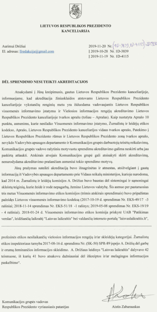 Teismas nurodė Zabarauskui dar kartą nurodyti motyvus, kodėl manęs negalima įleisti į prezidento spaudos konferencijas.
