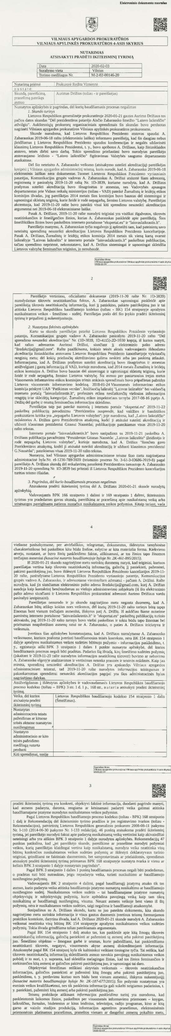Tada prokurorė Vinterytė ir sugalvojo – patarėjas Zabarauskas, parašęs man „pažymą“ apie valstybės priešą Aurimą Drižių, nepadarė nieko, kad „šio rašto turinys būtų žinomas bent vienam trečiam asmeniui, išskyrus A.Drižių. Prokurorė taip pat nurodo, kad tik A.Drižiaus iniciatyva A.Zabarausko laiško turinys buvo viešai paskelbtas portaluose „laisvaslaikraštis.lt“ ir „ekspertai.eu“ tik paties A.Drižiaus veiksmais“.