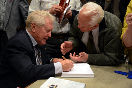 | Prof. Romualdas Grigas pasirašo ant savo išleistos knygos „Lietuvių tautos išlikimo drama“. Nuotr. Žilvino Petkaus |