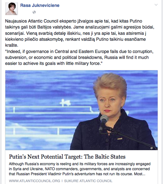 Konservatorė Rasa Juknevičienė savo facebook paskyroje pranešė apie naujausią Atlantic Council eksperto įžvalgą.