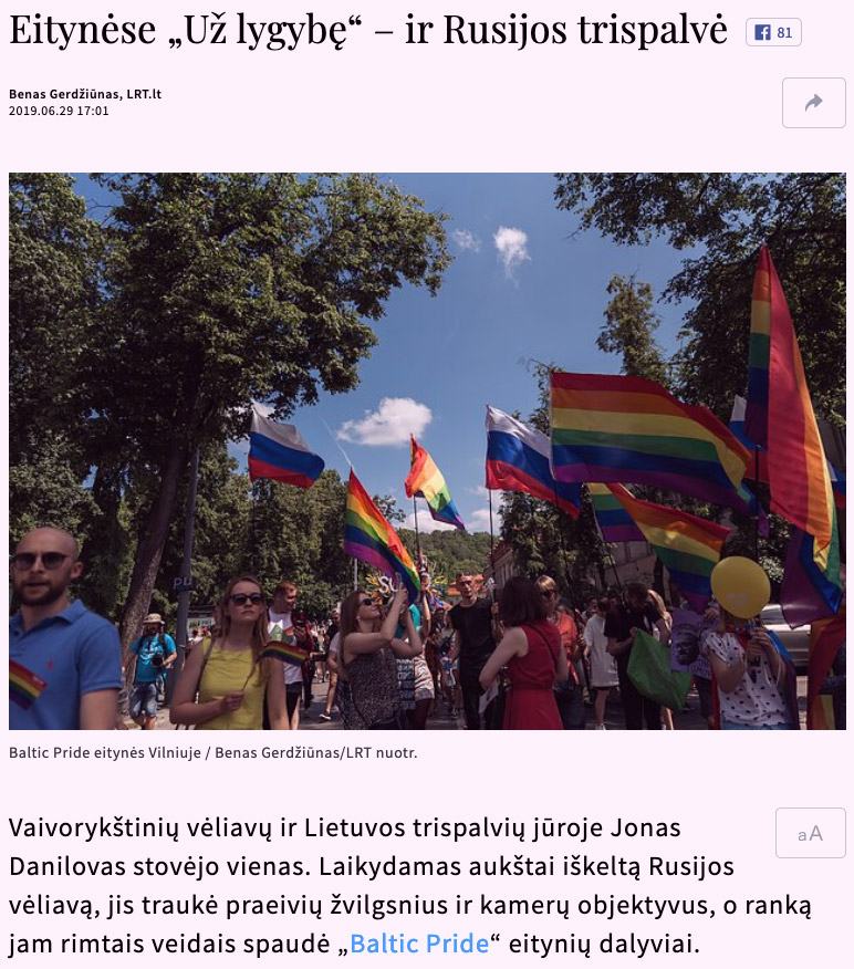 Paaiškėjo, kad J. Danilovas „laikydamas aukštai iškeltą Rusijos vėliavą“, „traukė praeivių žvilgsnius ir kamerų objektyvus, o ranką jam rimtais veidais spaudė „Baltic Pride“ eitynių dalyviai“.