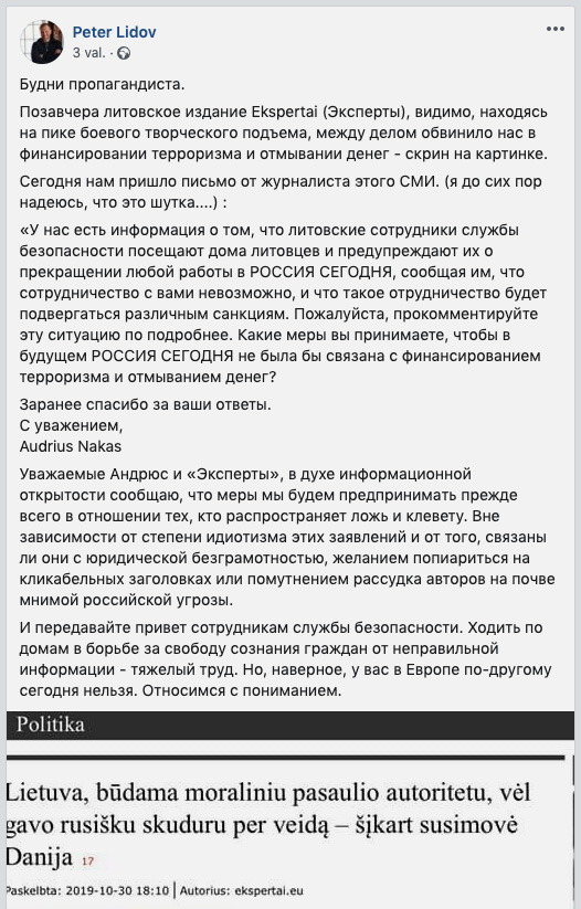 „ROSSIYA SEGODNYA“ komunikacijos direktorius Piotras Lidovas visuomeniniuose tinkluose taip pat išsakė savo komentarą: