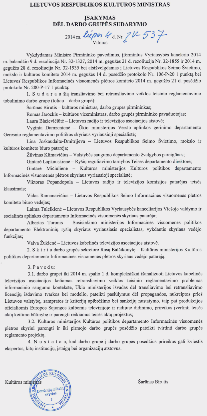 Šią savaitę darbą pradėjo Kultūros ministro Šarūno Biručio vadovaujama Transliavimo ir retransliavimo veiklos teisinio reglamento tobulinimo darbo grupė, kuri iki spalio mėnesio pateiks pasiūlymus dėl propagandos, nukreiptos prieš Lietuvos valstybę, sampratos bei sankcijų nustatymo, peržiūrės teisės aktus, reglamentuojančius transliuotojų ir retransliuotojų veiklą mūsų šalyje, taip pat svarstys, kaip padidinti produkcijos oficialiomis ES kalbomis televizijoje ir radijuje.