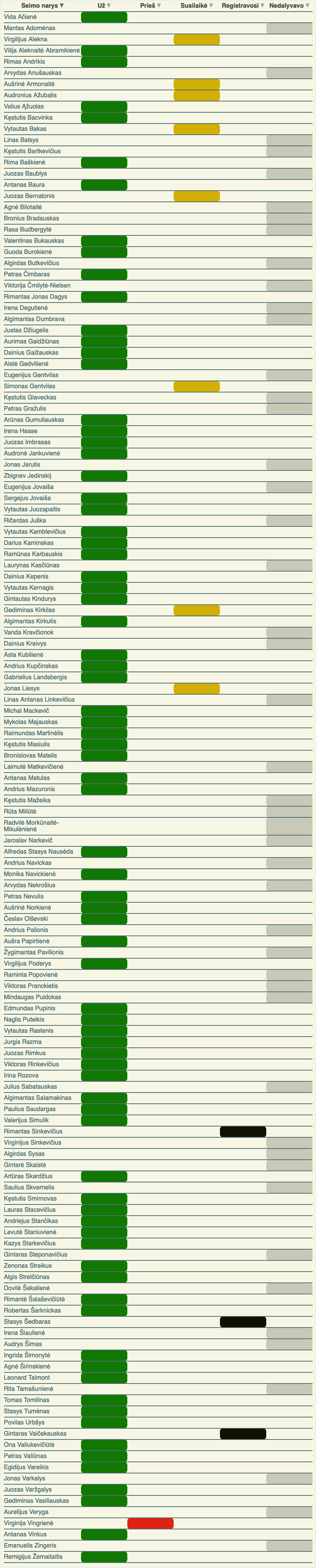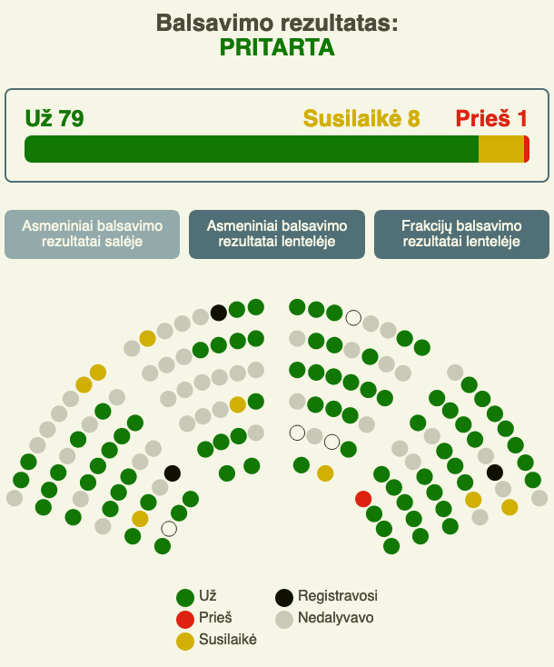 „Už“ balsavo 79 Seimo nariai, „susilaikė“ 8, „prieš“ buvo tik viena Seimo narė – žalioji valstietė Virginija Vingrienė.
