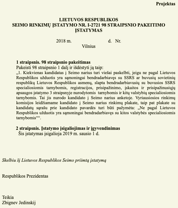 Rugsėjo 24 d. Seimas po pateikimo priėmė nagrinėjimui Seimo nario Zbignevo Jedinskio prieš metus su signataru Zigmu Vaišvila paruoštus Seimo rinkimų, Prezidento rinkimų, Europos parlamento narių rinkimų ir Savivaldybių rinkimų įstatymų pataisų įstatymų projektus, pagal kuriuos kandidatai, dalyvaujantys šiuose rinkimuose, turės deklaruoti savo bendradarbiavimą ne tik su buvusios TSRS ir TSRS sąjunginių respublikų specialiosiomis tarnybomis, bet ir su kitų valstybių specialiosiomis tarnybomis.
