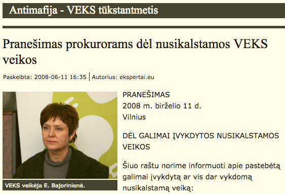 Galima tik priminti, kad pirmą kartą ekspertai.eu, tuomet dar naiviai nieko nežinodami, kaip veikia nusikalstamas Lietuvos teisėsaugos pasaulis ir tikėdamiesi teisingumo, į prokuratūrą kreipėsi 2008 m. birželio 11 d. ir ikiteisminis tyrimas buvo nedelsiant pradėtas dėl nedidelio VEKS epizodo – septyniomis kalbomis Lietuvą pasaulyje garsinančio portalo lietuva.gyvai.eu.