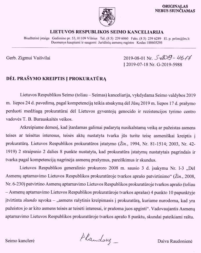 Gavau 2019 m. rugpjūčio 1 d. Seimo kanceliarijos atsakymą, kuriuo į prokuratūrą siūloma kreiptis man pačiam. 2019 m. rugpjūčio 5 d. Zigmo Vaišvilos raštu kreipiausi į Seimo kanceliariją, primindamas, kad nustačius galimai nusikalstamas veikas, privaloma apie tai pranešti teisėsaugai, taip pat paprašiau, kad Seimo kanceliarija pateiktų man visą šio tyrimo medžiagą.